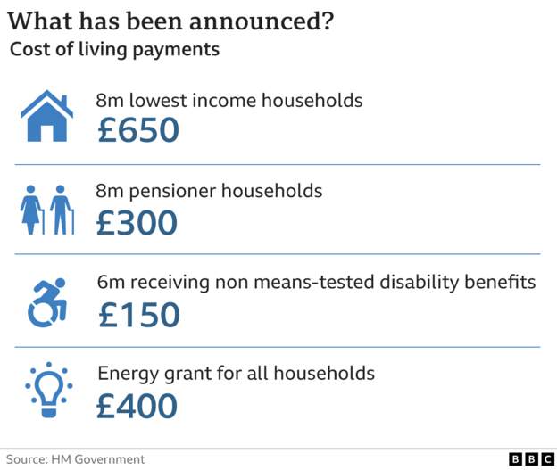 - 8 million low-income households who receive Universal Credit, tax credits, pension credit and other means-tested benefits will receive payments of £650. This payment will be made straight into bank accounts. The first payment of £326 was made in July 2022, and a second instalment will be transferred in the Autumn.